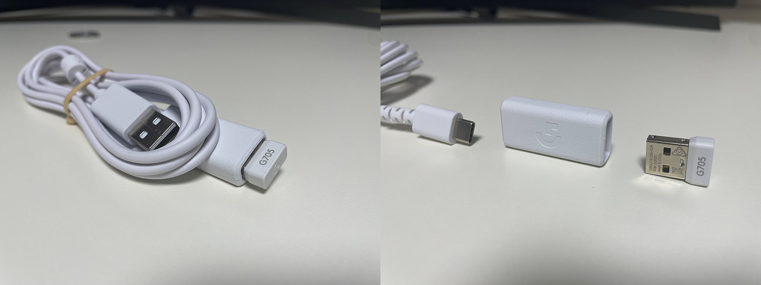 케이블은 키보드와 같이 고무 케이블을 택하였습니다. 케이블 외에 USB 젠더, 그리고 동글이 세트로 따라옵니다.