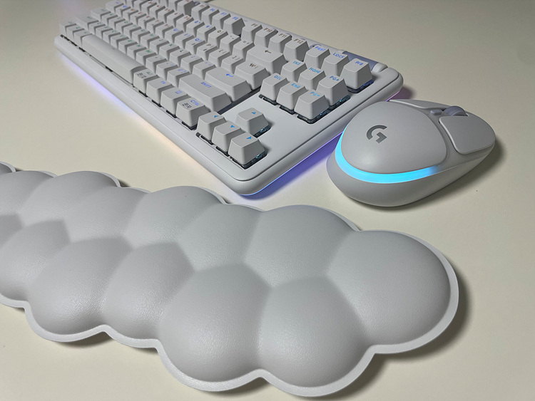 구름모양의 팜레스트입니다. 재질은 흰색 인조가죽이며, 메모리폼 까진 아니고 그냥 말랑말랑한 고무 같습니다.