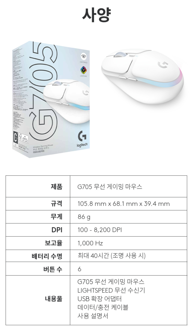 다음은 G705의 사양입니다. 6 버튼 타입이고 충전식 무선 마우스입니다. 그리고 센서와 파워플레이 지원에 대한 정보가 없는데, 아직 출시 초기라 그런지 구글링해도 후기가 안보입니다. DPI가 최대 8200인걸 봐선 고급 센서는 아닐 듯합니다.